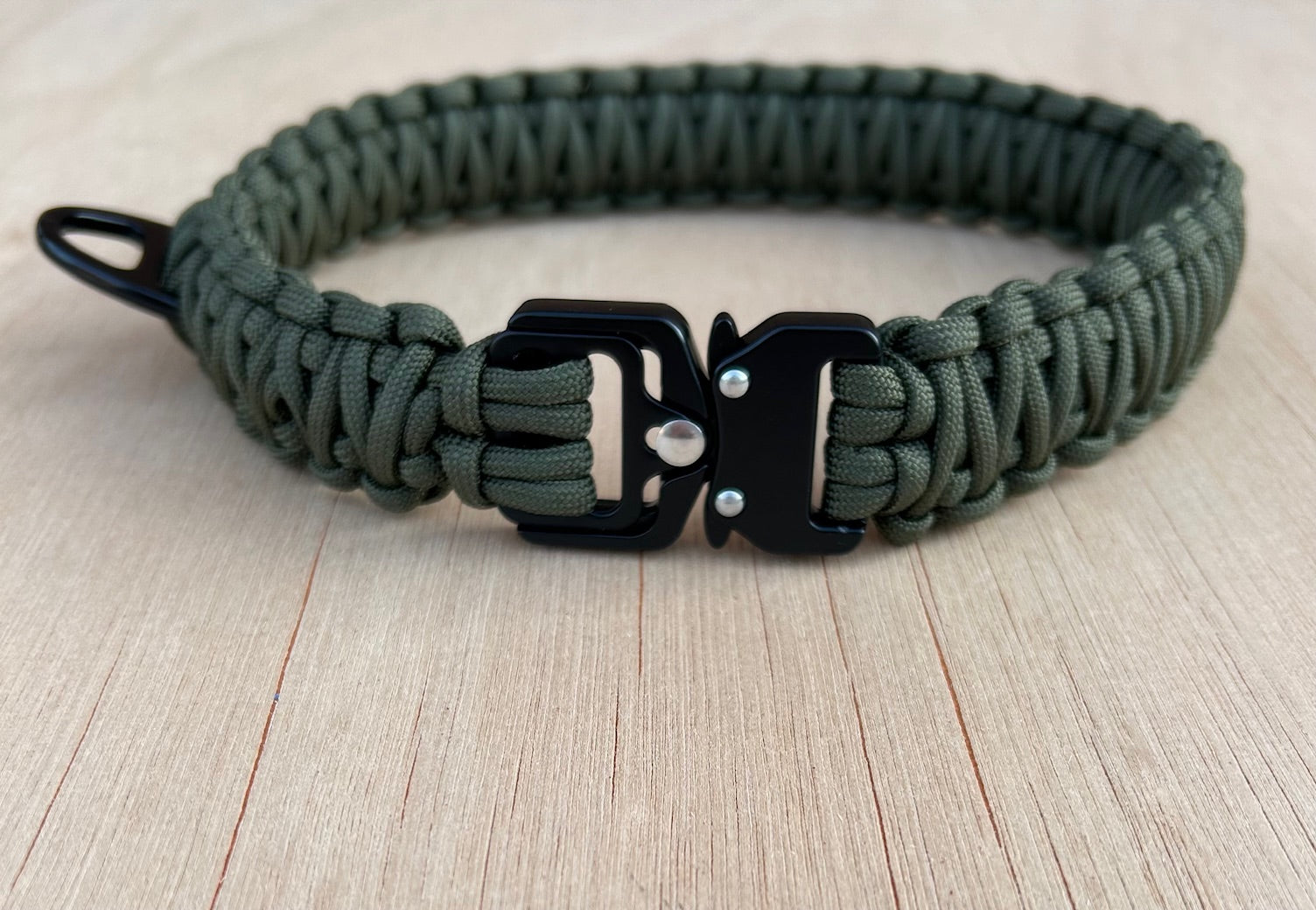 This dog collar is made in a king cobra weave, approximately 3cm wide, and is fitted with a heavy duty metal tactical buckle available in black. Perfect for collars over 35cm in length.